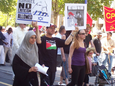 Again from down under: an anti-Israeli* demo in Melbourne, as documented by Nilk. Two of my favorites: