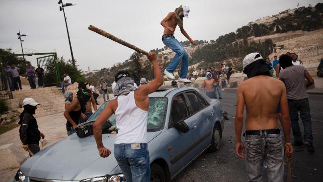 Palestinians attack the car of a Jewish settlement security guard, who later shot one of the assailants. Picture: Getty Images Source: The Australian