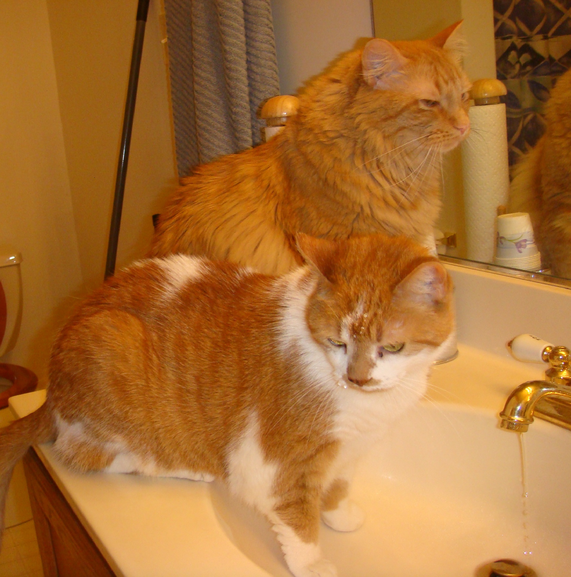 You know, that old Chicago song, when you think about it, was really weird. Lyrics are rather stupid. But you know what’s not stupid? My cats. Okay, well, yeah, they are, but–first we have a twofer of Tig and Gracie on the bathroom vanity.