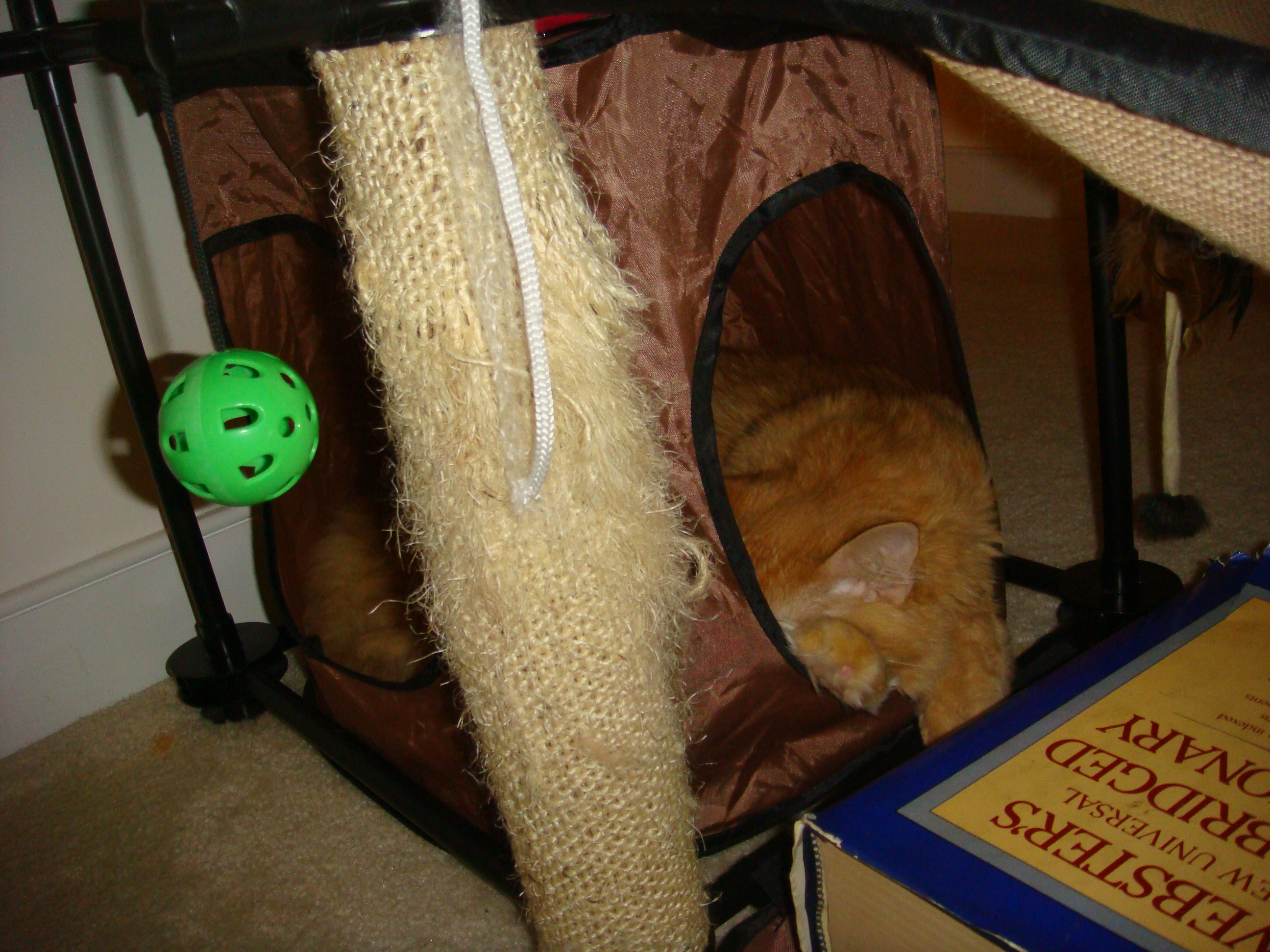 Last, Tig asleep in his kitty condo. Best $20 I ever spent at Target. He sleeps in, on top, and around, and also plays in it. And announces to me that he is going to go to sleep in or on it. It’s annoying to me, but funny to anyone who’s around. He yowls and yells until he settles in. Sorta like this: “Mom, I’m going to sleep in the condo! Mom, I’m getting up on the condo! Mom, I’m on the condo! Mom, I’m lying down and ready to sleep now!”