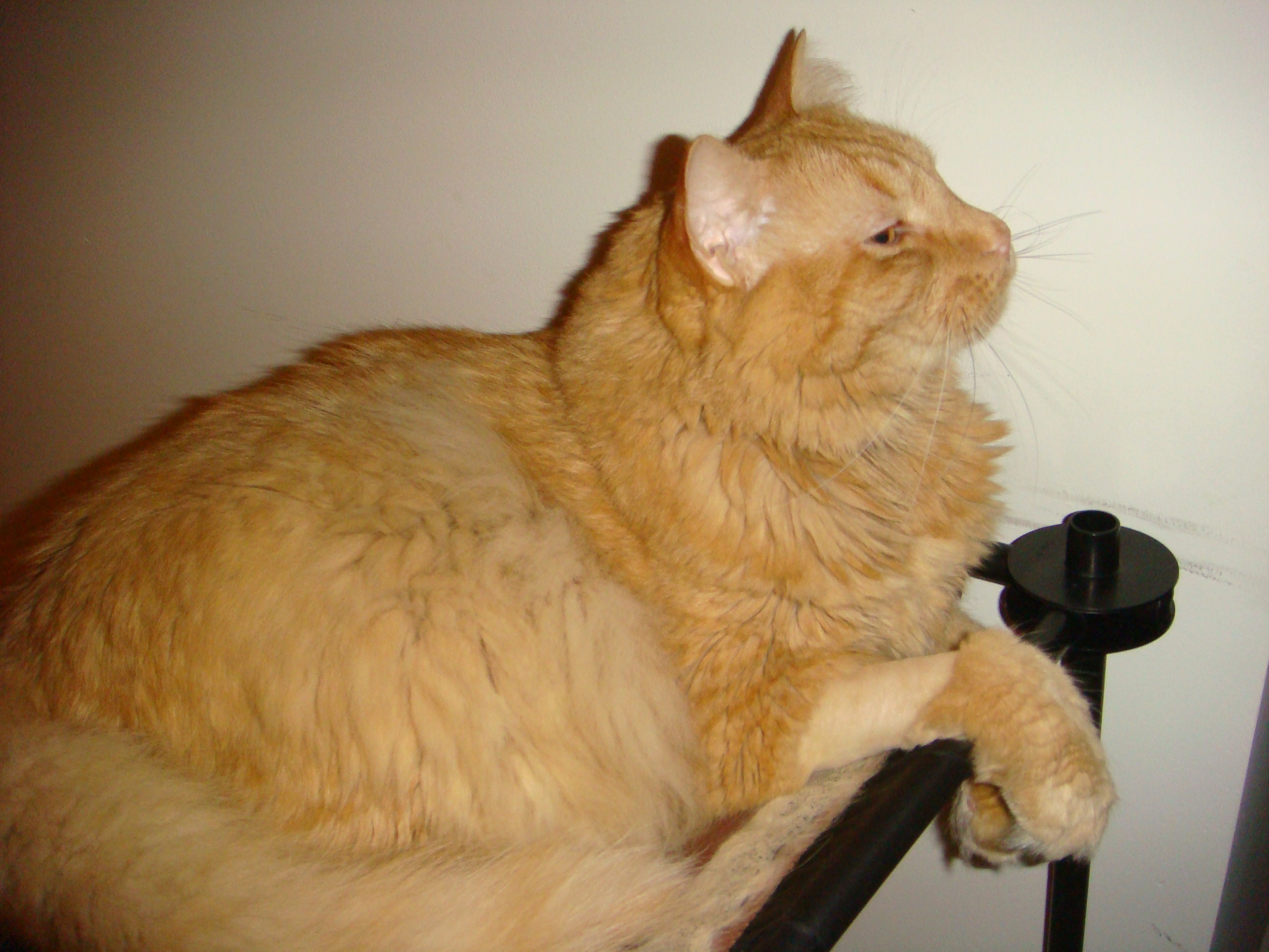 Now, for Tig, who is recovered (mostly) from his surgery and renal problems. His front paw was shaved for the IV, and he has what we call “monkey butt” from his bottom being shaved, but it’s no longer all pink. His orange fur has begun the slow process of growing back.