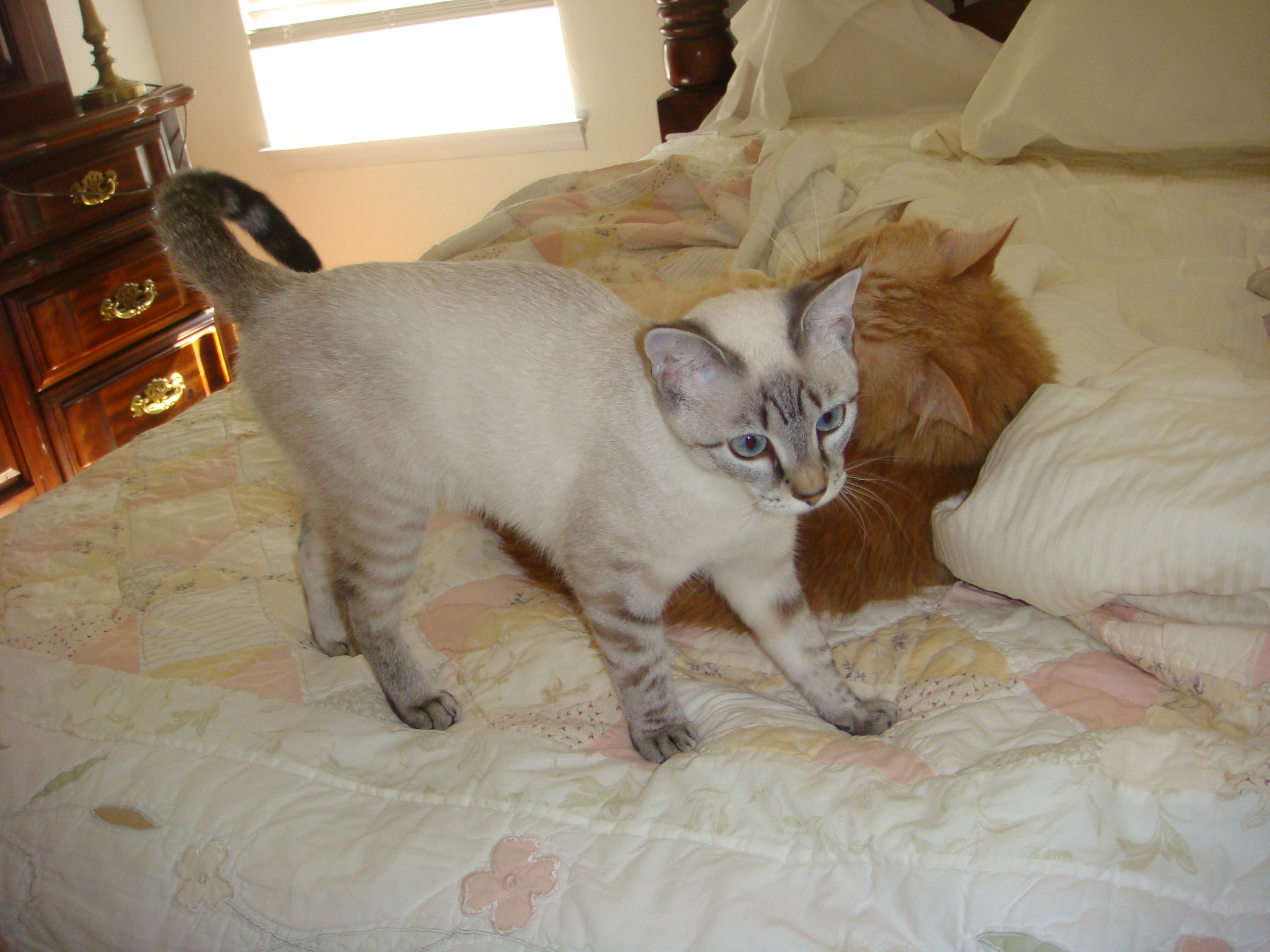I have a two-bedcat morning more often than not. And it’s pretty amusing to find Meimei sleeping on my legs with no knowledge of her getting there. She’s so tiny and light that she climbs on and off me all night long and never wake me, unlike Tig, who is (sigh) approaching twenty pounds, I think. When he sits on my legs, trust me, it wakes me up. What is it with cats and legs, anyway?
